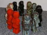 After about 2005 Collector demand spiked up sharply when the general world of “Tiki” collectors discovered these little gems. Prices doubled and tripled overnight. Most of these shakers have the pour holes in-line running from front to back. The flame set below and the flame set displayed in the Frank home in Sapulpa have the holes running sideways. I believe the flame Tikis are associated with a "Sweetheart's Luau" widow maker mug T4S. Frankoma produced this as a limited issue in 1969. The mug is the same flame glaze as the Tiki shakers.