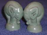 The 160H elephants are one of the most desired Frankoma shaker pairs. They may not be as cute as the #166H bulls, but they are more difficult to find. This is a circus style pose which Frankoma also made in a miniature animal shape with only very slight modifications. The miniature animal version comes in two sizes but with one exception the shaker sets all seem to be the same size and design.