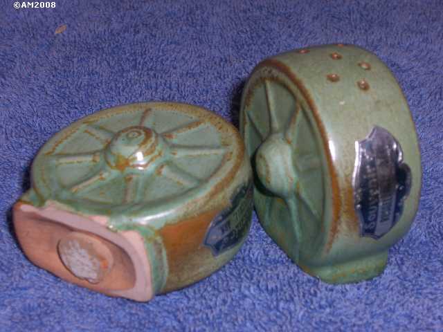 94H Wagon Wheels, prairie green glaze. S7/P7 holes set, double diamond group. This is the pink clay in use after 1968-1970. The rutile is still the strong American type so the glaze has good contrasts. About this time Frankom started to glaze the bottoms of all pieces but these remain unglazed. Souvenir of Russellville, Ark.