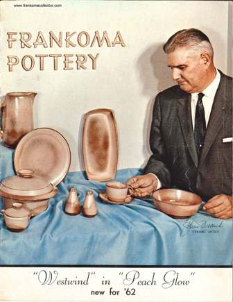 The all new 1962 catalog is again a full 8.5" x 11" with all four covers in full color. With this catalog Frankoma introduced the new glaze Peach Glow, one that would last only twelve years. More importantly the glaze is showcased on the entirely new Westwind dinner ware line. Frankoma would continue that line well into the twenty-first century.