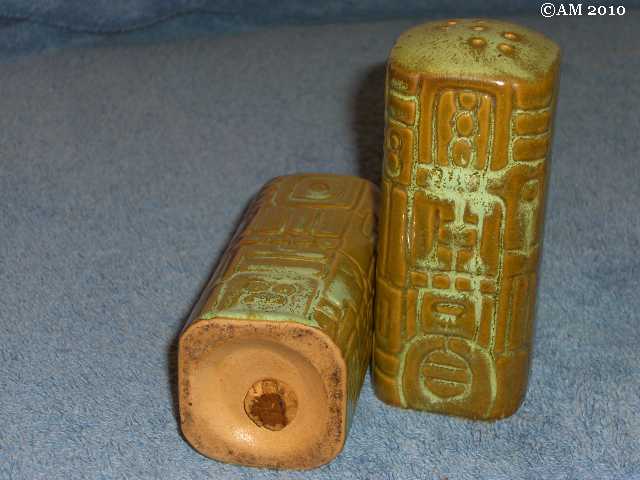 7H Myan-Aztecs, prairie green glaze; S7/P7, double diamond hole pattern. This surprising set combines pure Ada clay with the double diamond pour holes dating it to late 1953 or early 1954. The new hole pattern became standard just before Frankoma started using Sapulpa red clay.