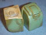 John Frank’s lifelong goal was to put art pottery in the home of the common man at an affordable price.  The design of the #45 Modern shaker put him in the forefront of the Art Deco movement.  He designed a Modern grease container or sugar bowl #46 to accompany these shakers.  This set has a very art-deco look and the two fit neatly together on the table.
