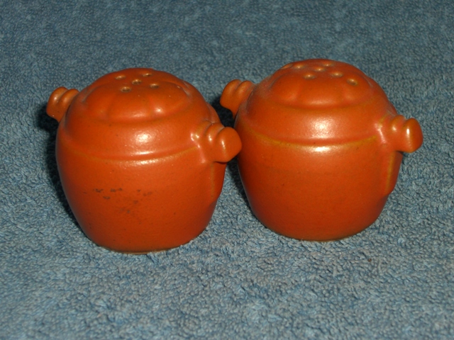 These shakers were issued before prairie green became the dominant glaze. It is easier to find the earlier shakers in a variety of glazes than it is to find the newer Wagonwheels shakers in a variety of glazes. Since they were not made as part of a popular dinnerware set and since the factory fire in the fall of 1938 stopped or reduced production, all of these pieces are difficult for the collector to find.